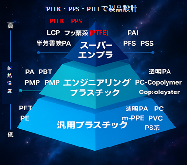 PEEK・PTFE・PPSといったスーパーエンプラを使用したモノ作りを得意としています。