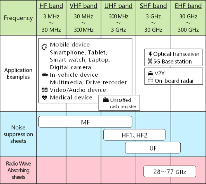We offer electromagnetic noise countermeasure sheets according to the electromagnetic environments. We have developed noise suppression sheets effective in the MHz to GHz band for near-field, as well as radio wave absorbing sheets effective in the sub-millimeter wave to millimeter wave band (20 to 90 GHz) for far-field. Additionally, we are developing thermal conductive sheets incorporating noise suppression functionality to address the growing demand for thermal countermeasure solutions in recent years. Through original material design, the base material is optimized to be high noise suppression performance while meeting the requirements of reliability for the on-vehicle environment. Our products are used not only in automotive equipment but also in a wide range of consumer appliances.