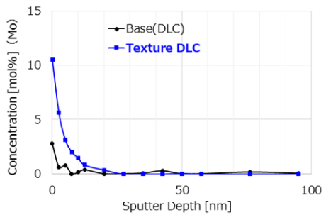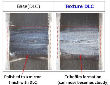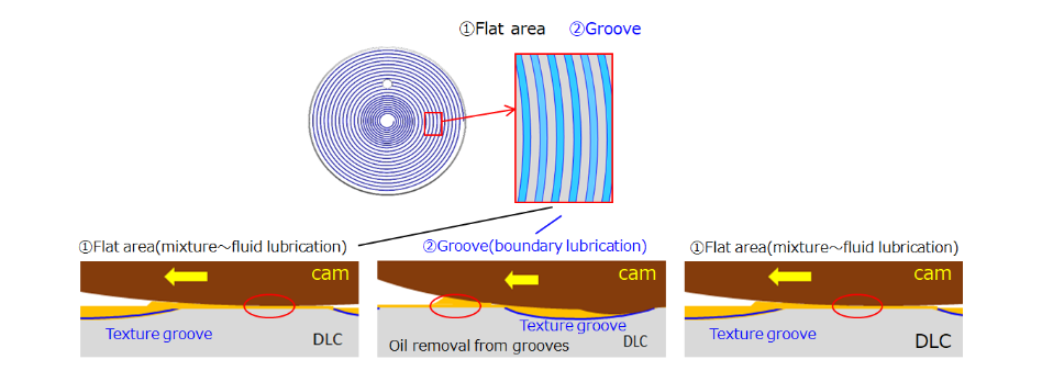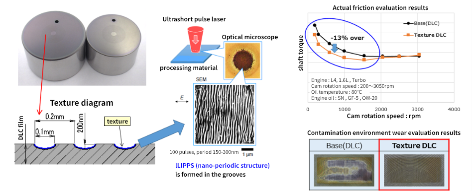 By applying textured grooves to the DLC surface using an ultrashort pulse laser, we improve low-friction performance and durability at low speeds, in the boundary lubrication and mixed lubrication ranges. This technology also enables compatibility with lower viscosity engine oils, contributing to improved fuel economy.