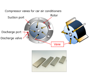 ・Our original high-performance aluminum alloy is used in vanes for car compressors, and is expected to be used in various mechanical parts for automobiles and motorcycles.
