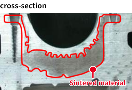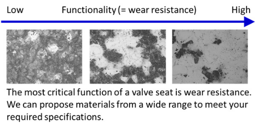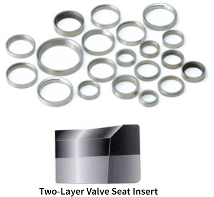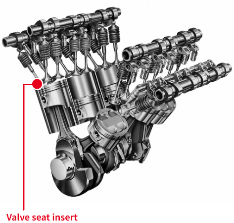 The "Valve seat insert", which is press-fitted into valve seating face part with cylinder head, is made of sintered alloy. This is important parts, which require durability that there is no deterioration by hitting at high temperature and which require high gas tightness that combustion gas is sealed certainly. NPR-Riken has offered the superior valve seat insert which meets high level of requirements of engines, making use of abundant material variation and material development power.