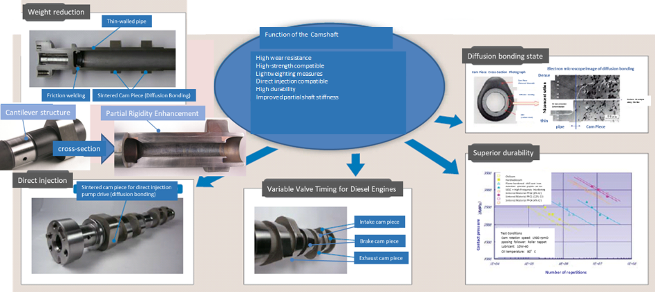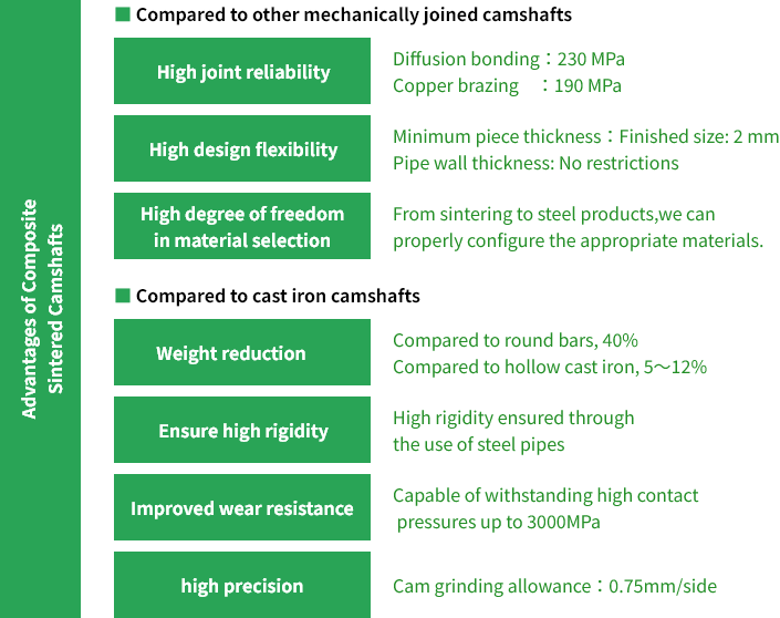 The P/M camshaft, boasting many features such as light weight, high contact pressure resistance, and narrow cam spacing, is a unique, patented product available only from NPR-Riken.It is manufactured by sintering the alloy steel cam lobes onto a steel tube. Journal parts are made by diffusion bonding sintered materials into one piece, bonding steel materials with copper brazing, or using a part of tube as a journal, processes that are customizable to meet the individual design specifications of the engines.