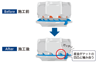座金がガッチリとナットを固定することで耐震性に優れ、施工後のナットの緩みを防止します。