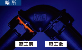 「オレンジライン」には蛍光色の紫外線発光塗料を採用していますので写真のように暗所でもブラックライトを用いて締め忘れの確認が容易に行えます。